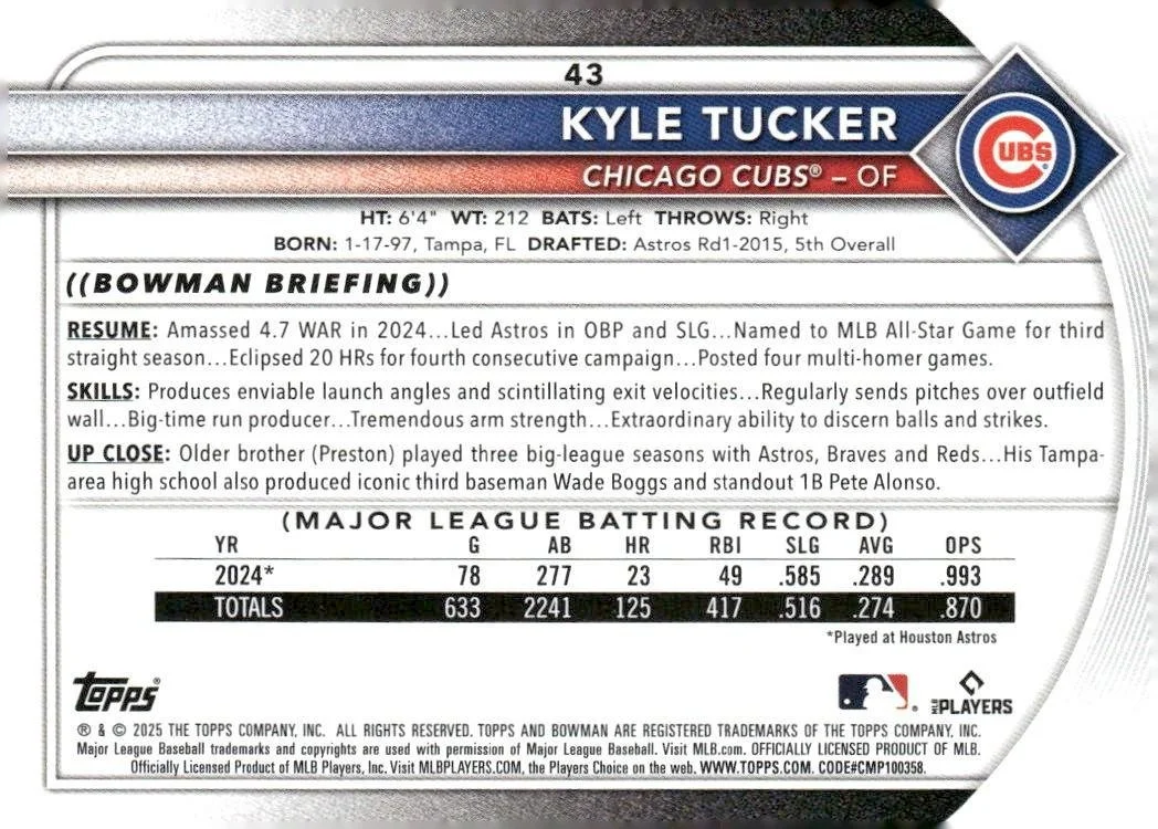 This is a nice example of a 2025 Bowman #43 Kyle Tucker