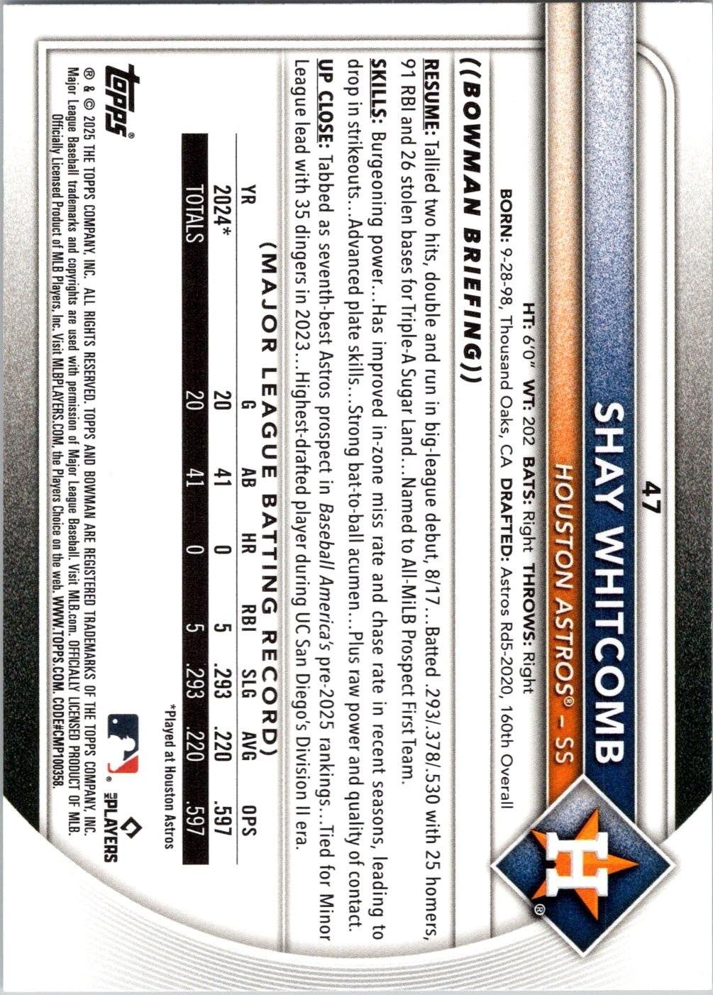 This is a nice example of a 2025 Bowman #47 Shay Whitcomb