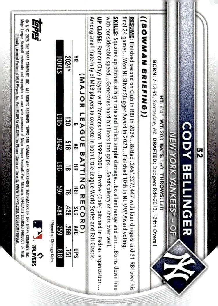 This is a nice example of a 2025 Bowman #52 Cody Bellinger