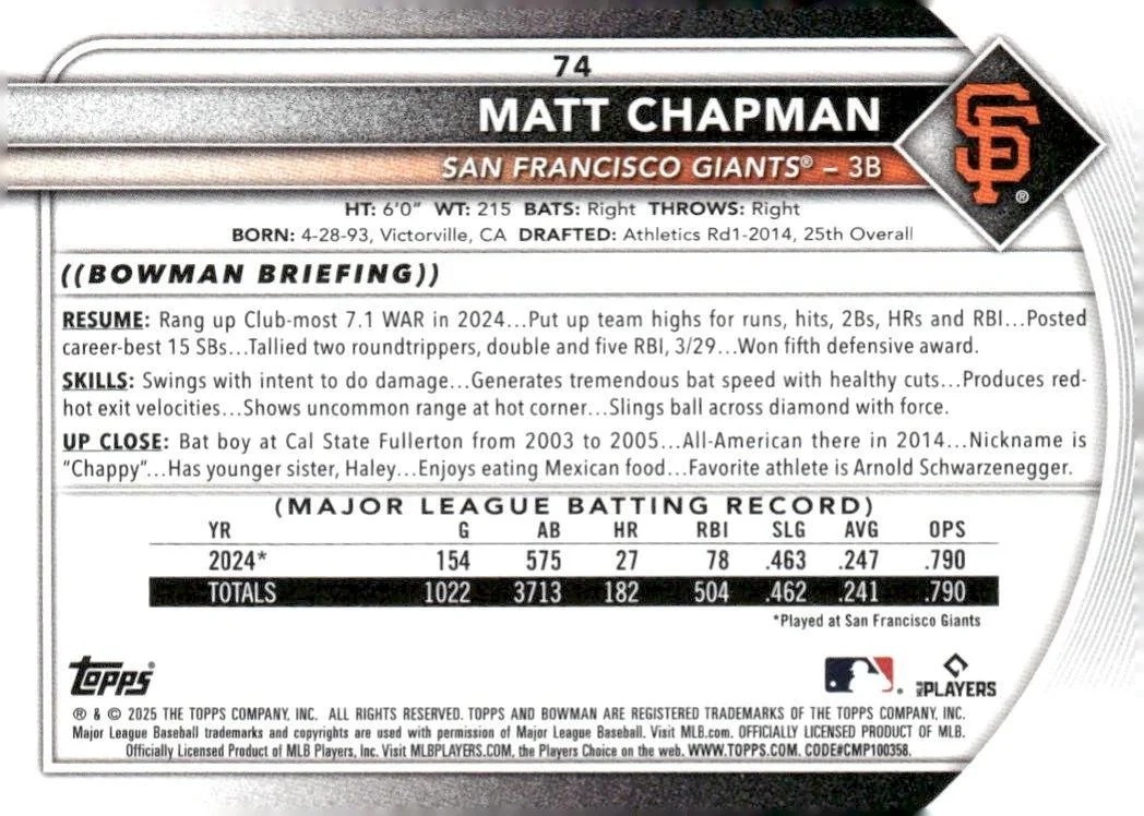 This is a nice example of a 2025 Bowman #74 Matt Chapman