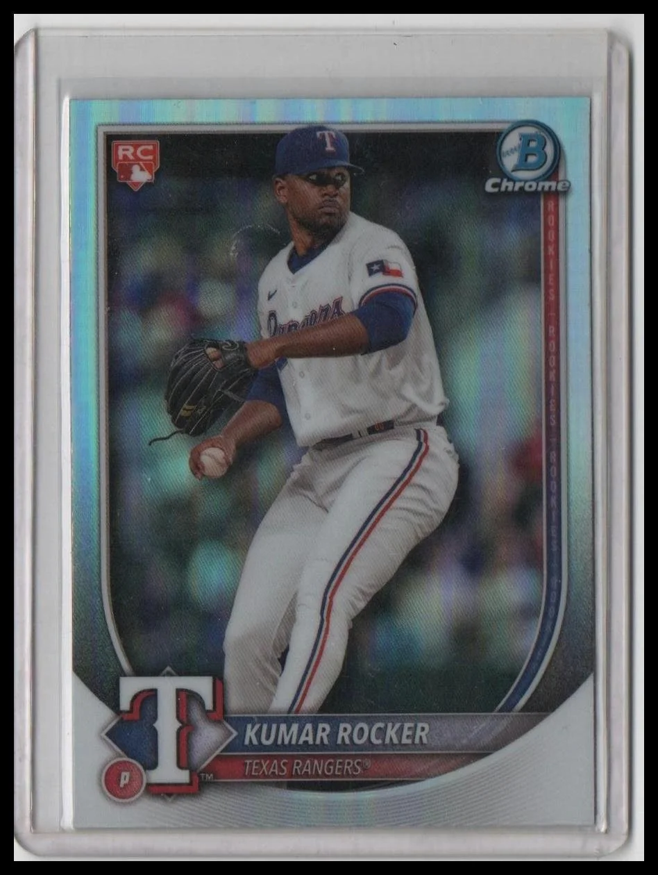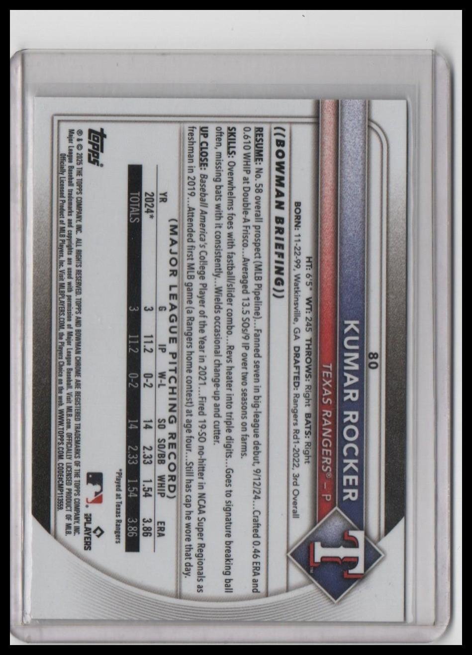 This is a nice example of a 2025 Bowman #80 Kumar Rocker Bowman Chrome Red Rookie Logo