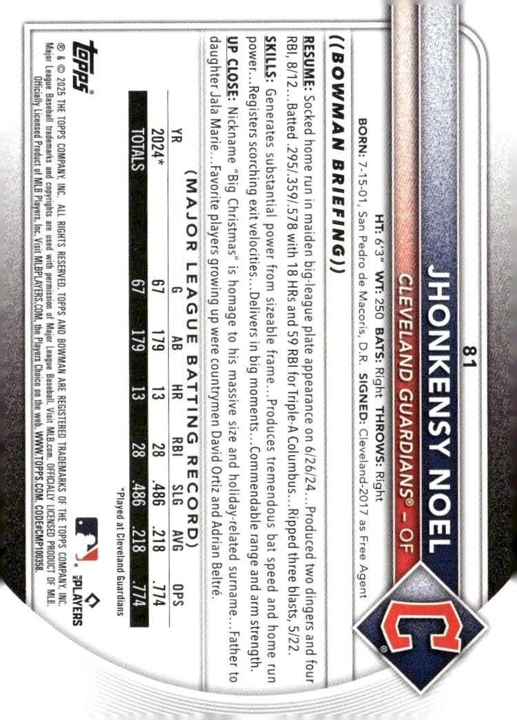 This is a nice example of a 2025 Bowman #81 Jhonkensy Noel
