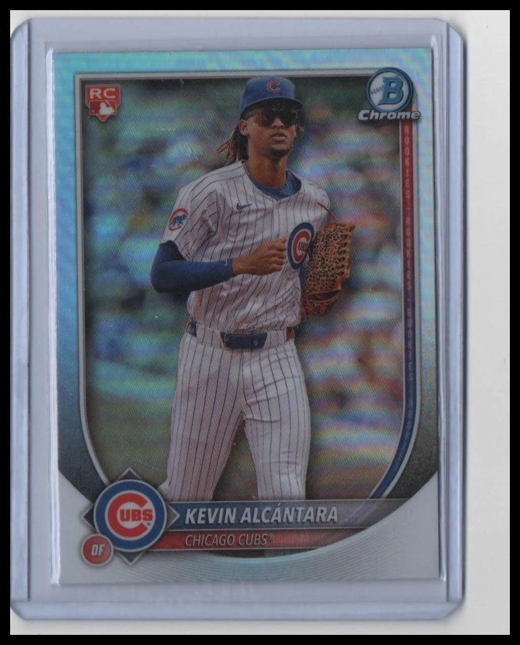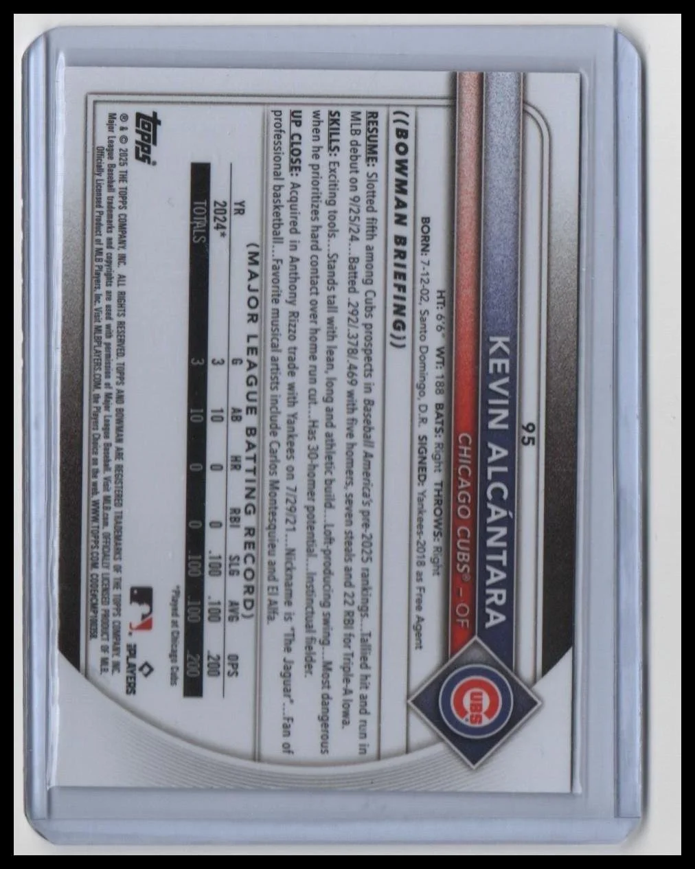 This is a nice example of a 2025 Bowman #95 Kevin Alcántara Bowman Chrome Red Rookie Logo