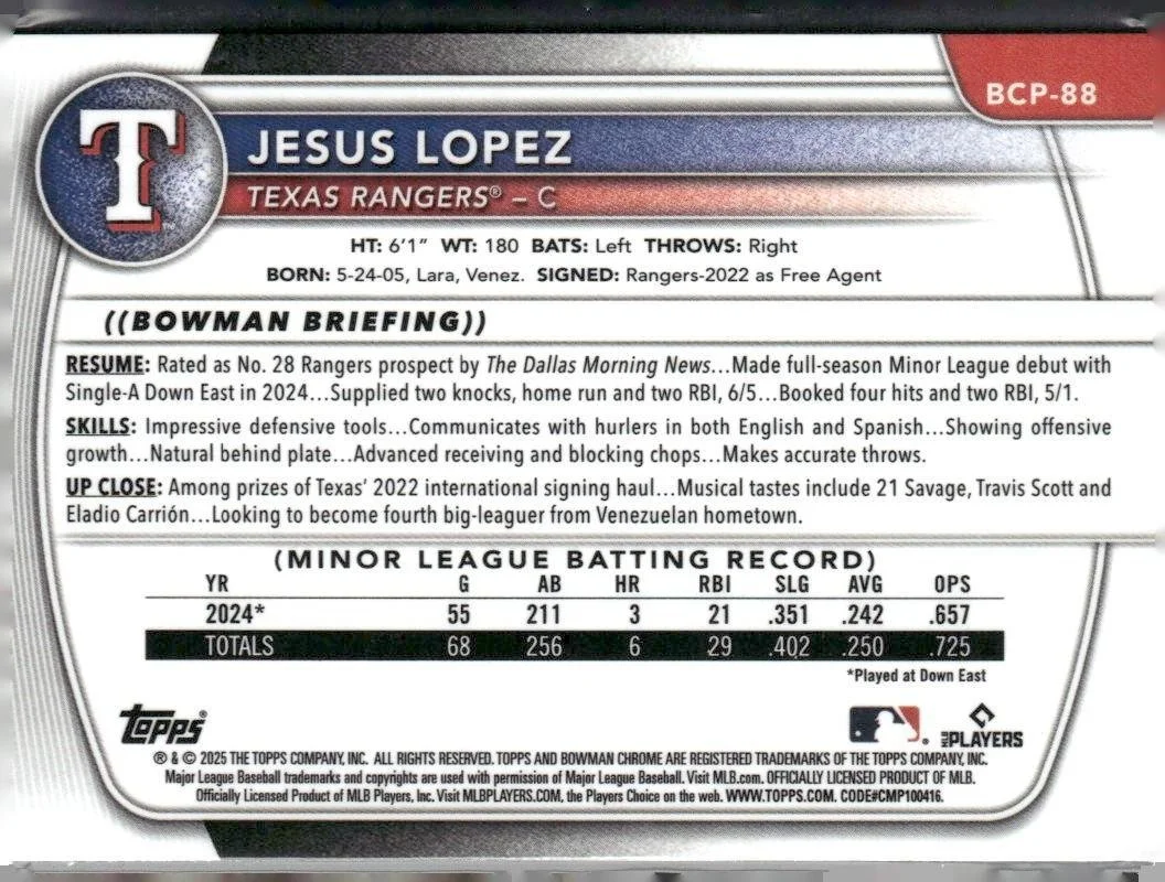 This is a nice example of a 2025 Bowman #BCP-88 Jesus Lopez Chrome Prospects