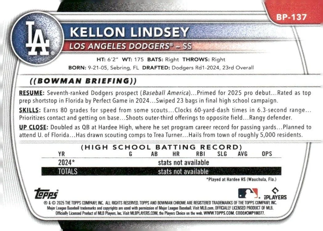 This is a nice example of a 2025 Bowman #BP-137 Kellon Lindsey Prospects