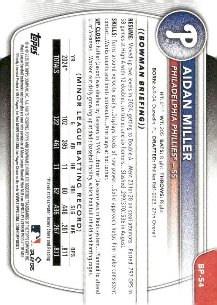 This is a nice example of a 2025 Bowman #BP-54 Aidan Miller Prospects