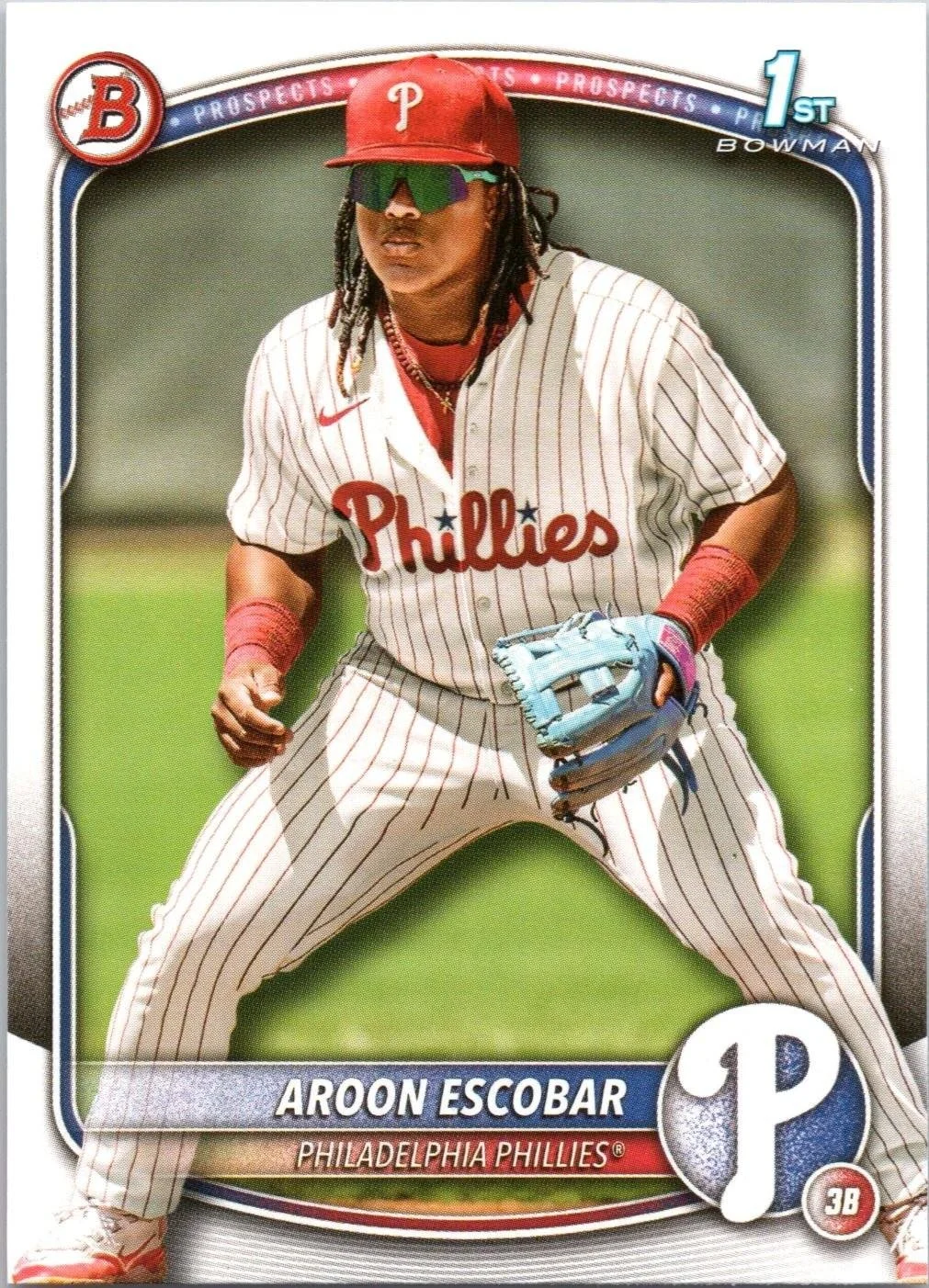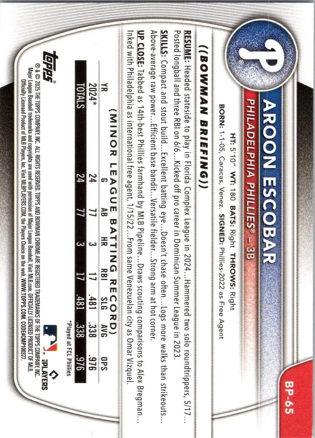 This is a nice example of a 2025 Bowman #BP-65 Aroon Escobar Prospects