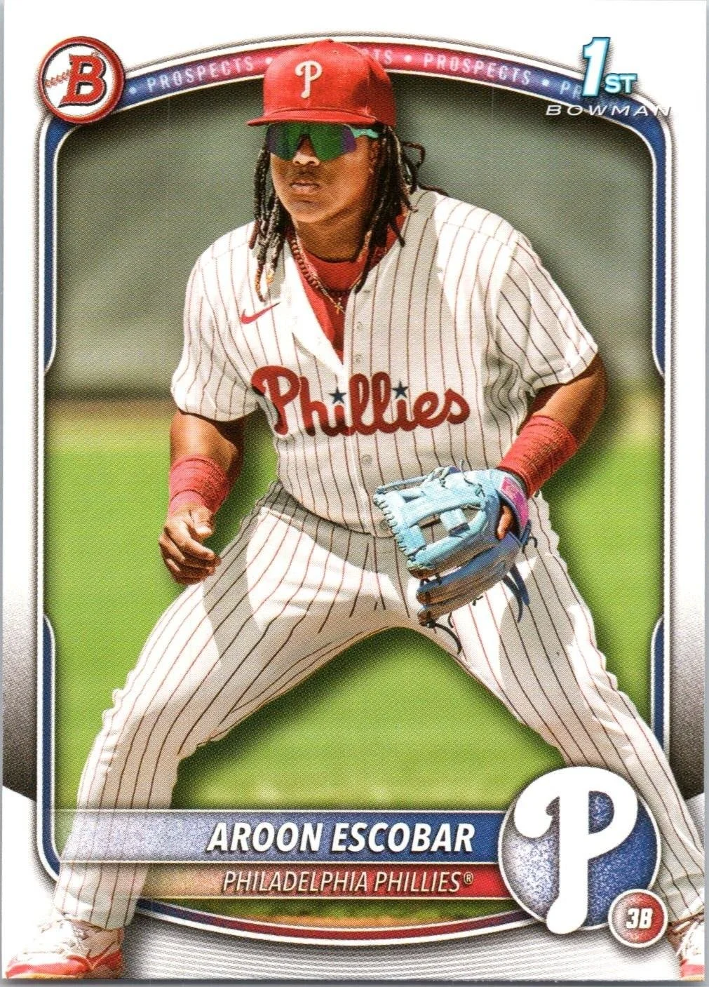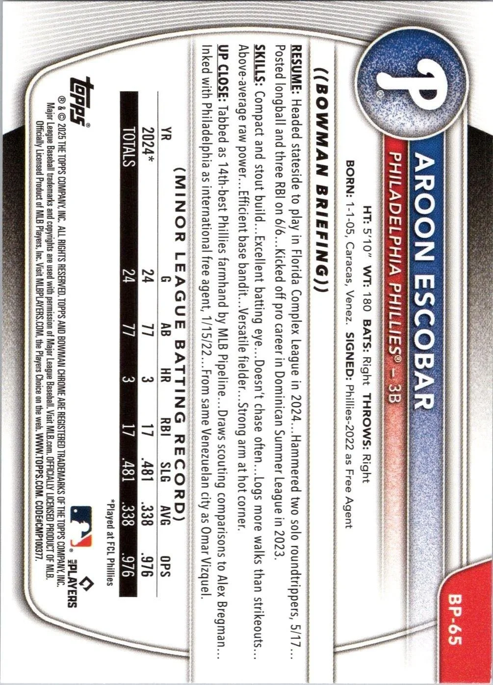 This is a nice example of a 2025 Bowman #BP-65 Aroon Escobar Prospects