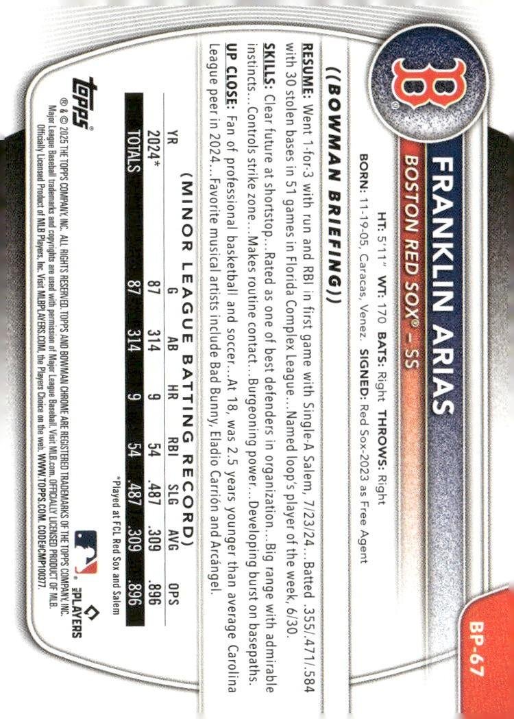 This is a nice example of a 2025 Bowman #BP-67 Franklin Arias Prospects