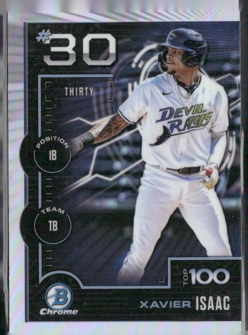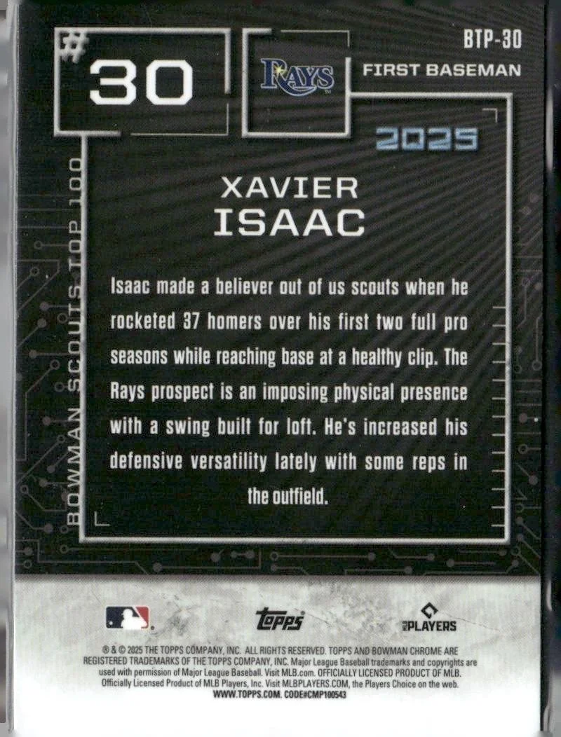 This is a nice example of a 2025 Bowman #BTP-30 Xavier Isaac Bowman Scouts Top 100