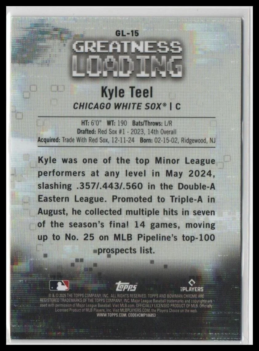 This is a nice example of a 2025 Bowman #GL-15 Kyle Teel Greatness Loading