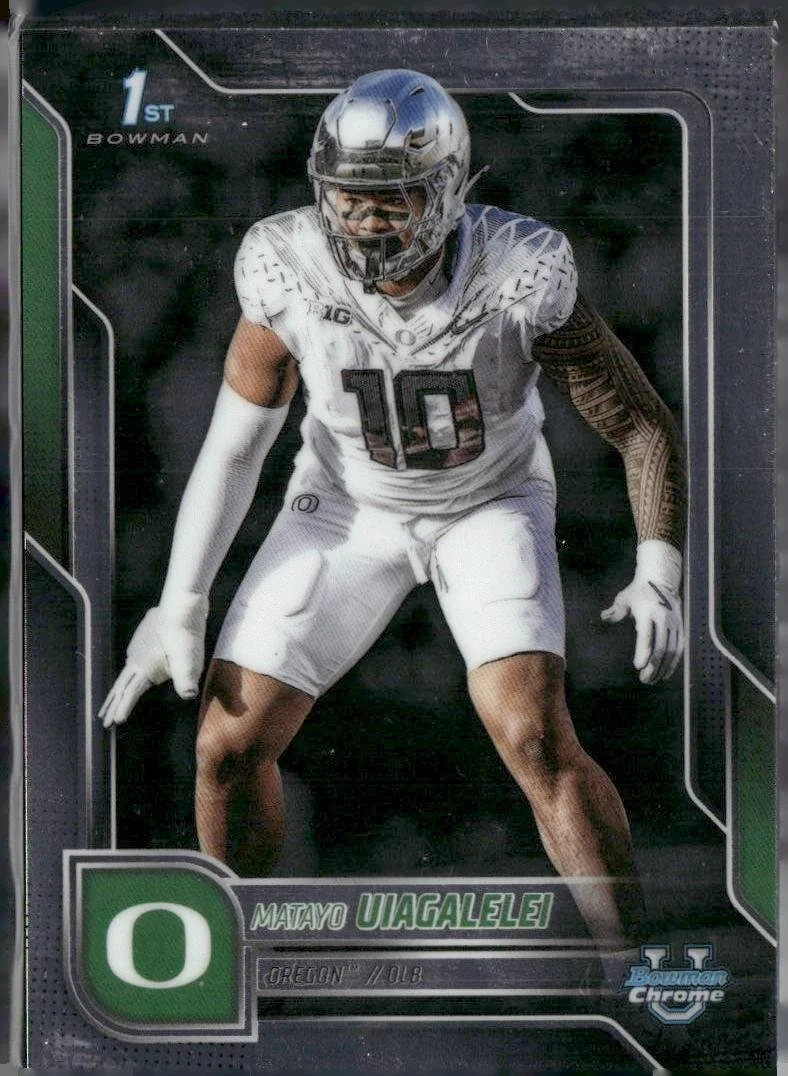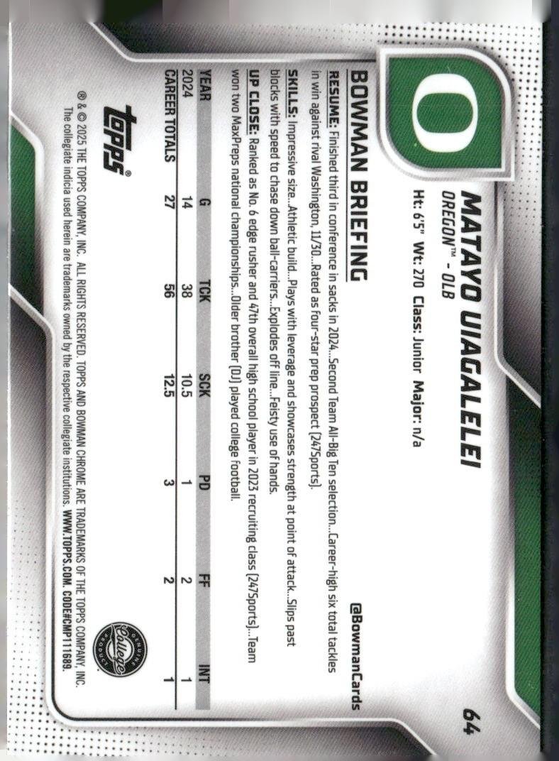 This is a nice example of a 2025 Bowman University Chrome #64 Matayo Uiagalelei