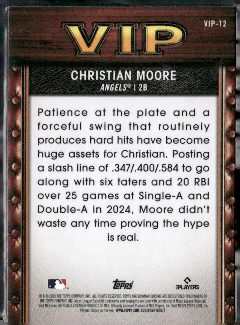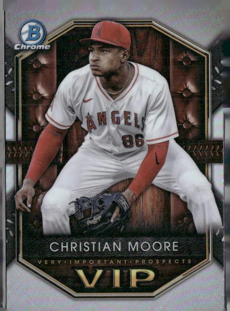 This is a nice example of a 2025 Bowman #VIP-12 Christian Moore Very Important Prospects