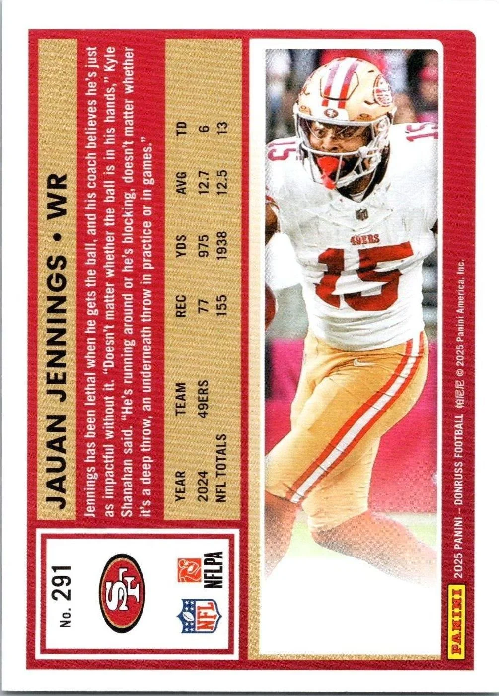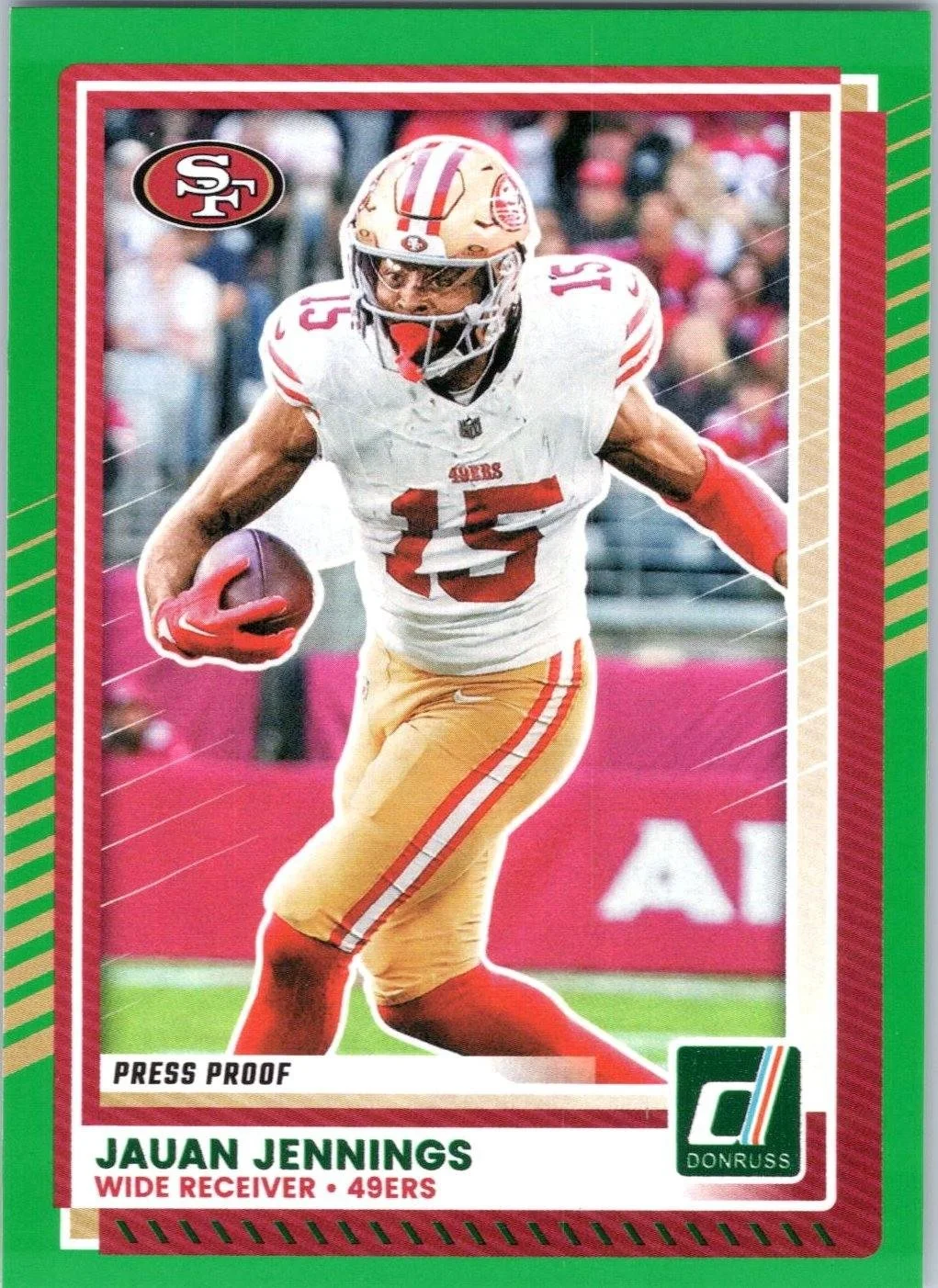 This is a nice example of a 2025 Donruss #291 Jauan Jennings Press Proofs Green