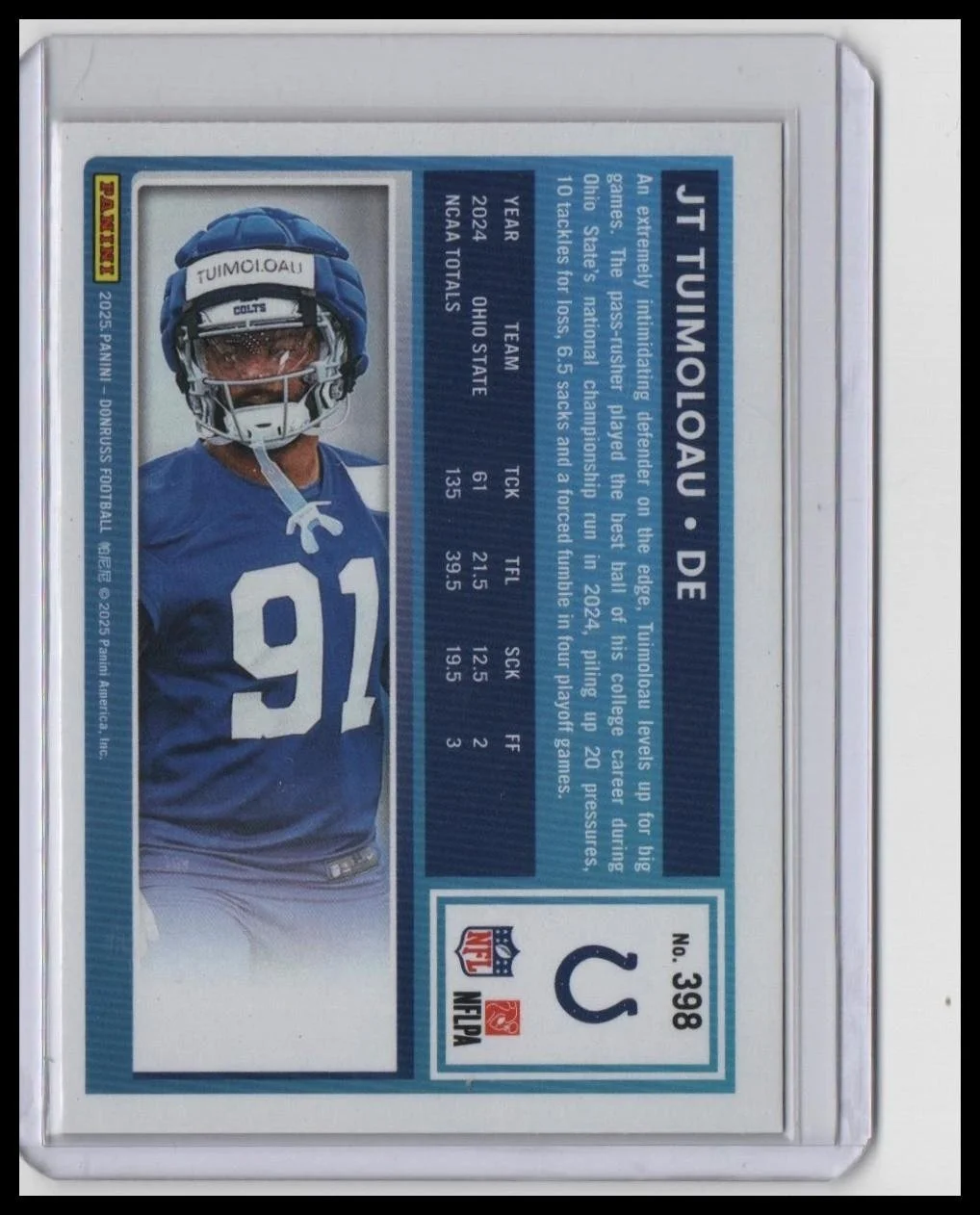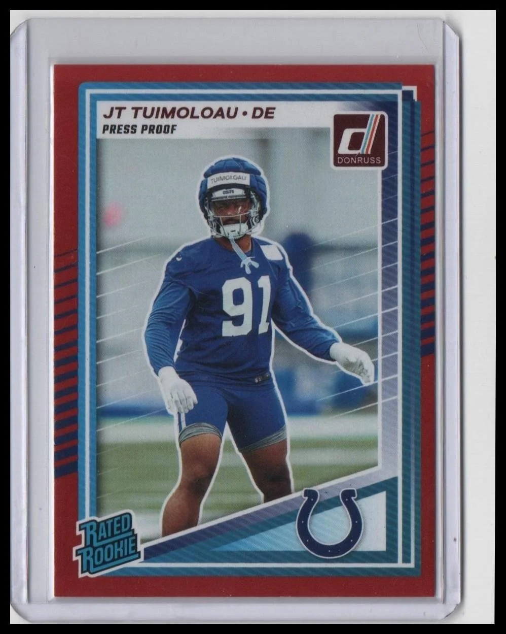 This is a nice example of a 2025 Donruss #398 JT Tuimoloau Optic Rated Rookies Preview Red Power