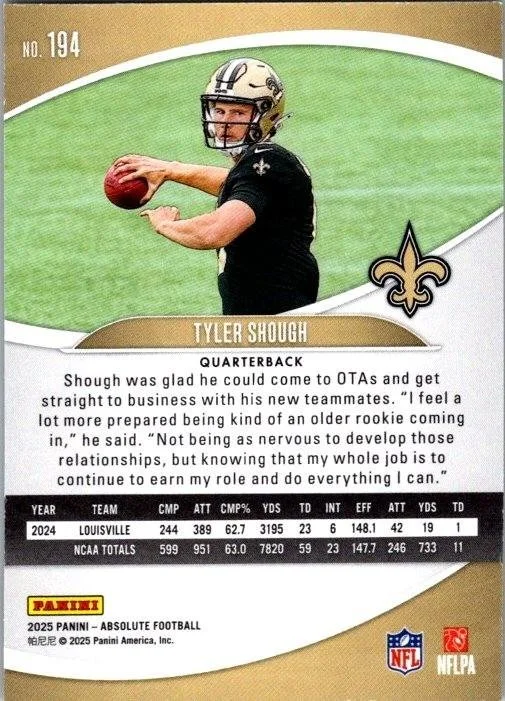 This is a nice example of a 2025 Panini Absolute #194 Tyler Shough Retail