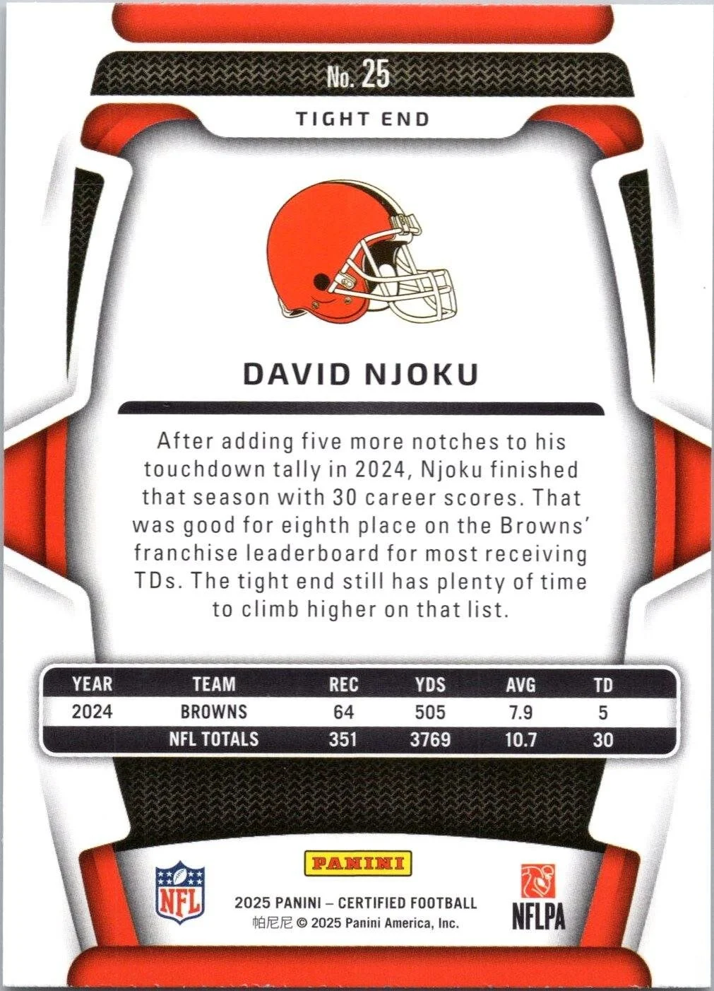 This is a nice example of a 2025 Panini Certified #25 David Njoku