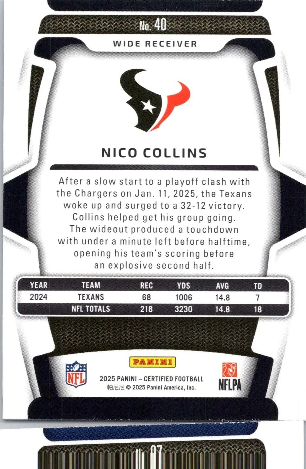 This is a nice example of a 2025 Panini Certified #40 Nico Collins