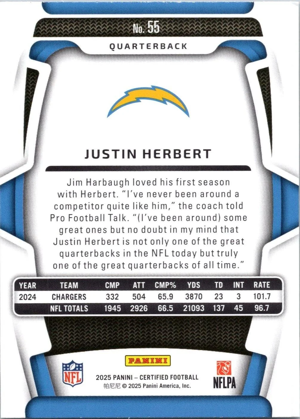 This is a nice example of a 2025 Panini Certified #55 Justin Herbert