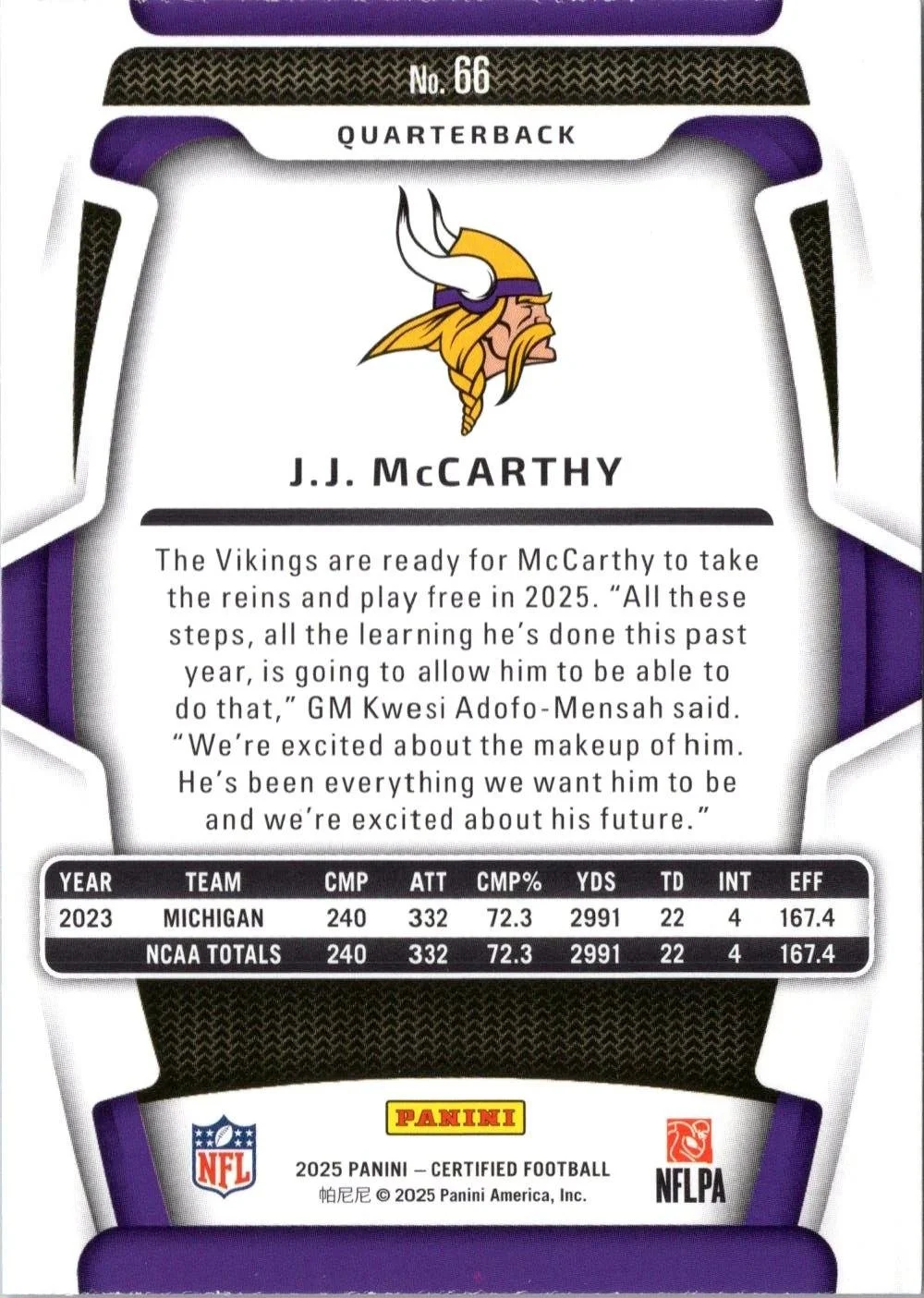 This is a nice example of a 2025 Panini Certified #66 J.J. McCarthy