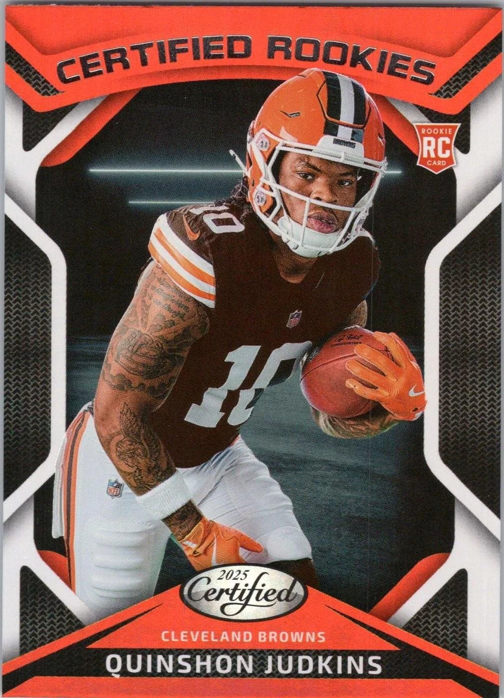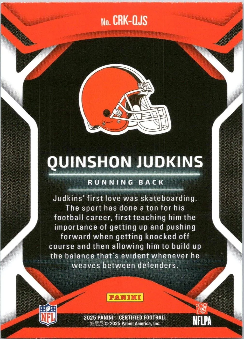This is a nice example of a 2025 Panini Certified #CRK-QJS Quinshon Judkins Certified Rookies