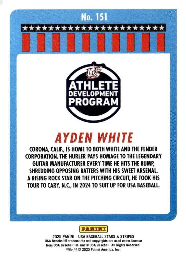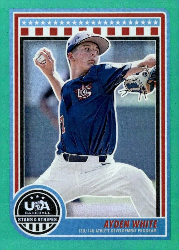 This is a nice example of a 2025 Panini Stars & Stripes USA Baseball #151 Ayden White Green