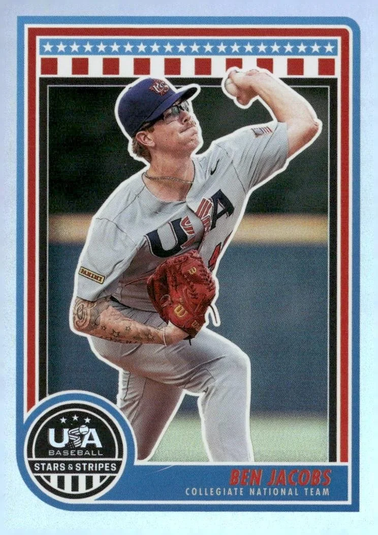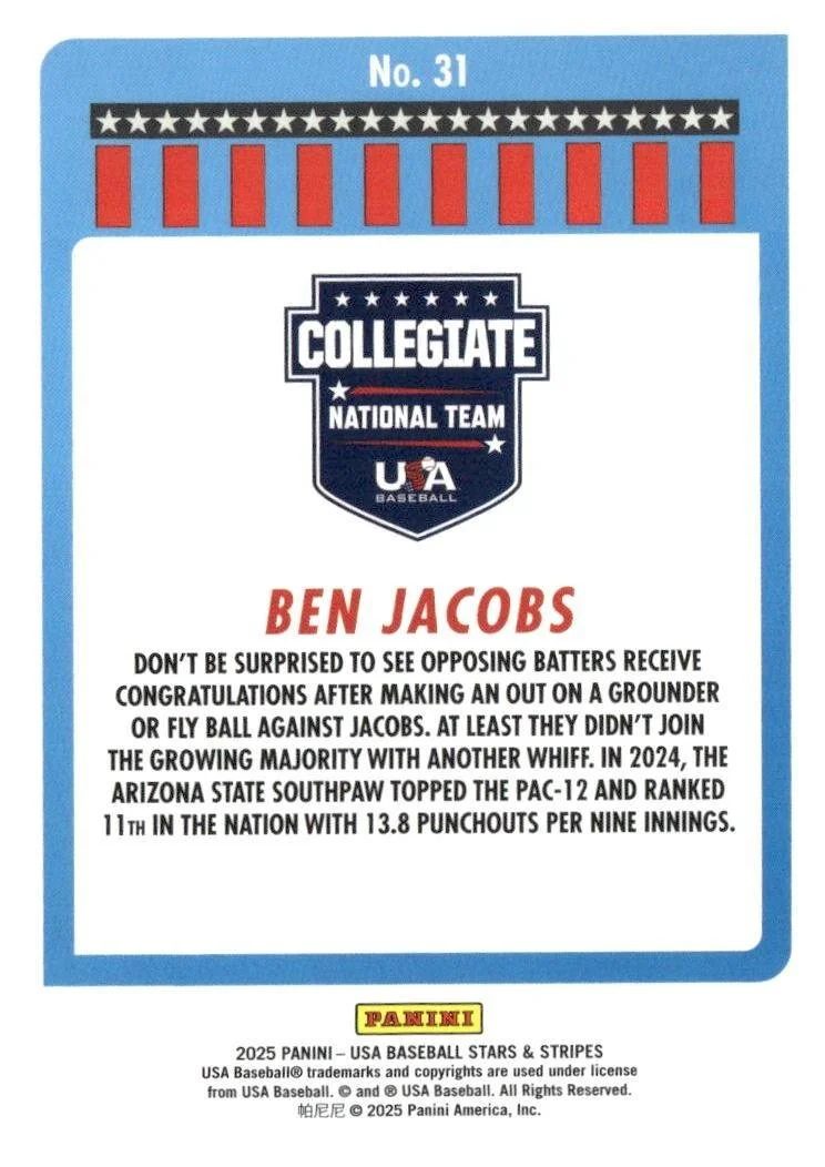 This is a nice example of a 2025 Panini Stars & Stripes USA Baseball #31 Ben Jacobs Stars