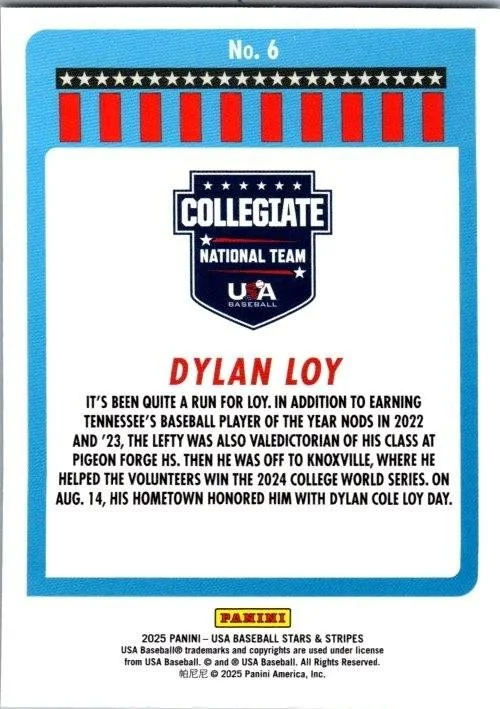 This is a nice example of a 2025 Panini Stars & Stripes USA Baseball #6 Dylan Loy Stars