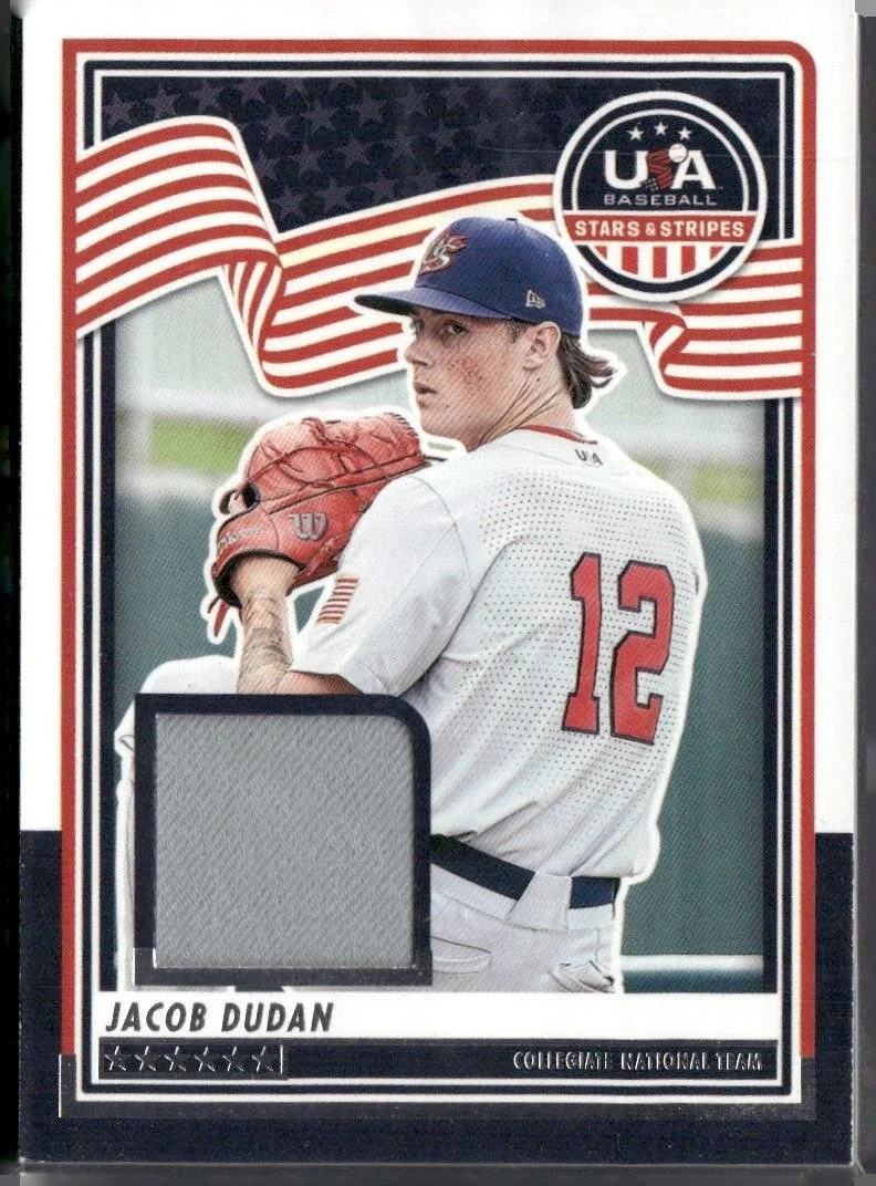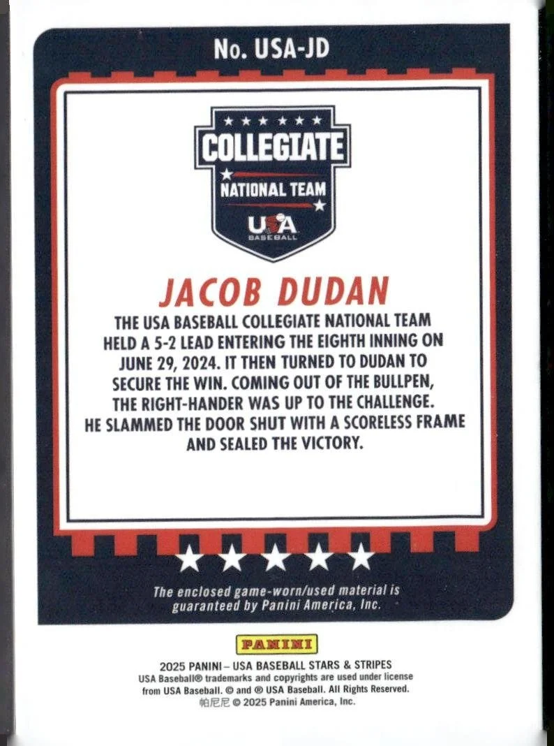 This is a nice example of a 2025 Panini Stars & Stripes USA Baseball #USA-JD Jacob Dudan Collegiate National Team Materials PE