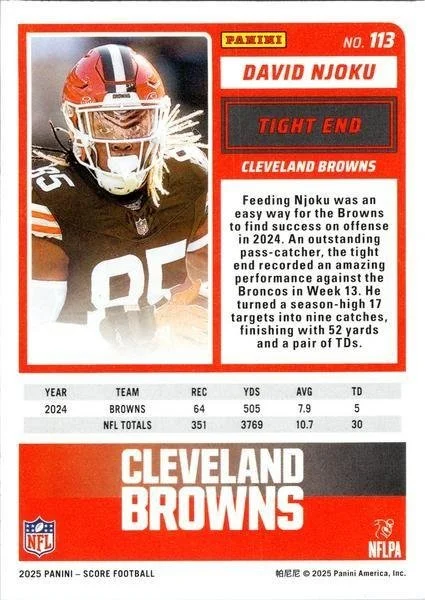 This is a nice example of a 2025 Score #113 David Njoku Scorecard