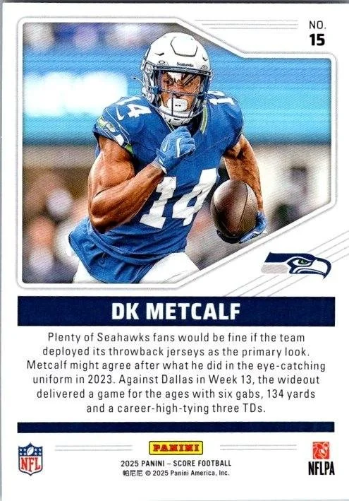 This is a nice example of a 2025 Score #15 DK Metcalf Throwbacks