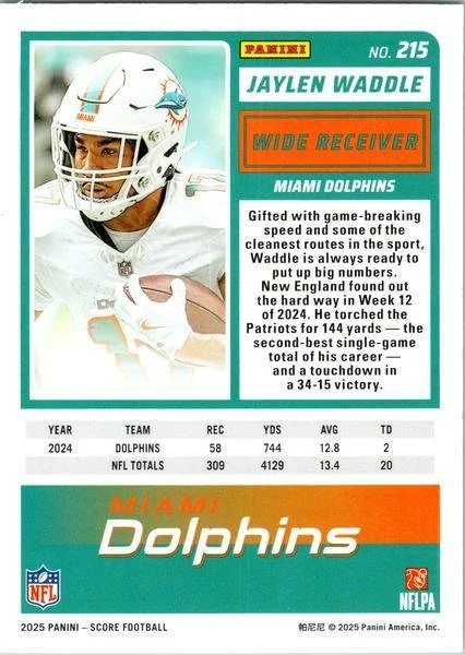 This is a nice example of a 2025 Score #215 Jaylen Waddle