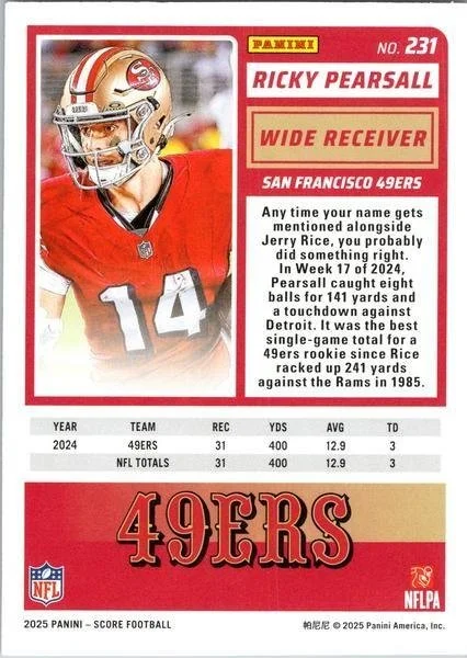 This is a nice example of a 2025 Score #231 Ricky Pearsall Scorecard