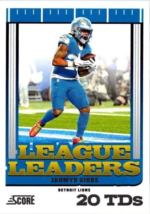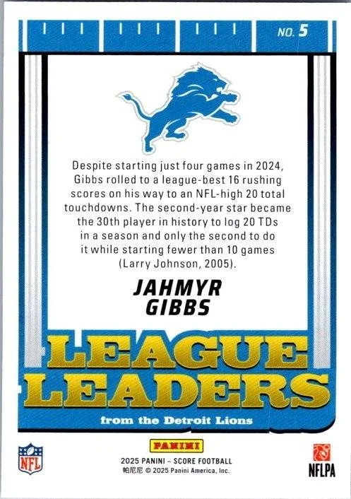 This is a nice example of a 2025 Score #5 Jahmyr Gibbs League Leaders