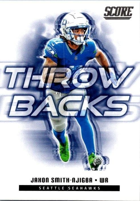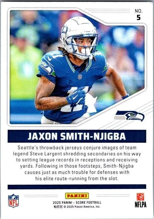 This is a nice example of a 2025 Score #5 Jaxon Smith-Njigba Throwbacks