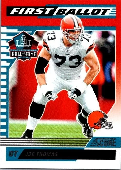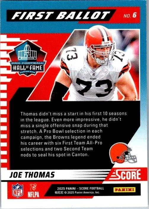 This is a nice example of a 2025 Score #6 Joe Thomas First Ballot Pink