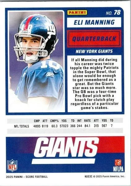 This is a nice example of a 2025 Score #78 Eli Manning Scorecard