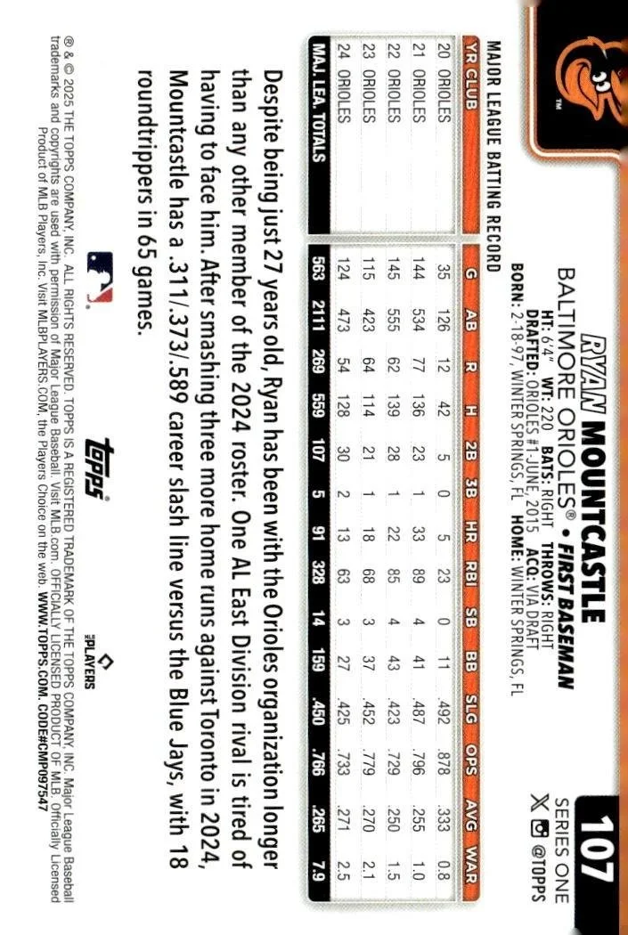 This is a nice example of a 2025 Topps #107 Ryan Mountcastle
