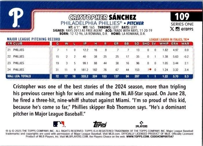 This is a nice example of a 2025 Topps #109 Cristopher Sánchez
