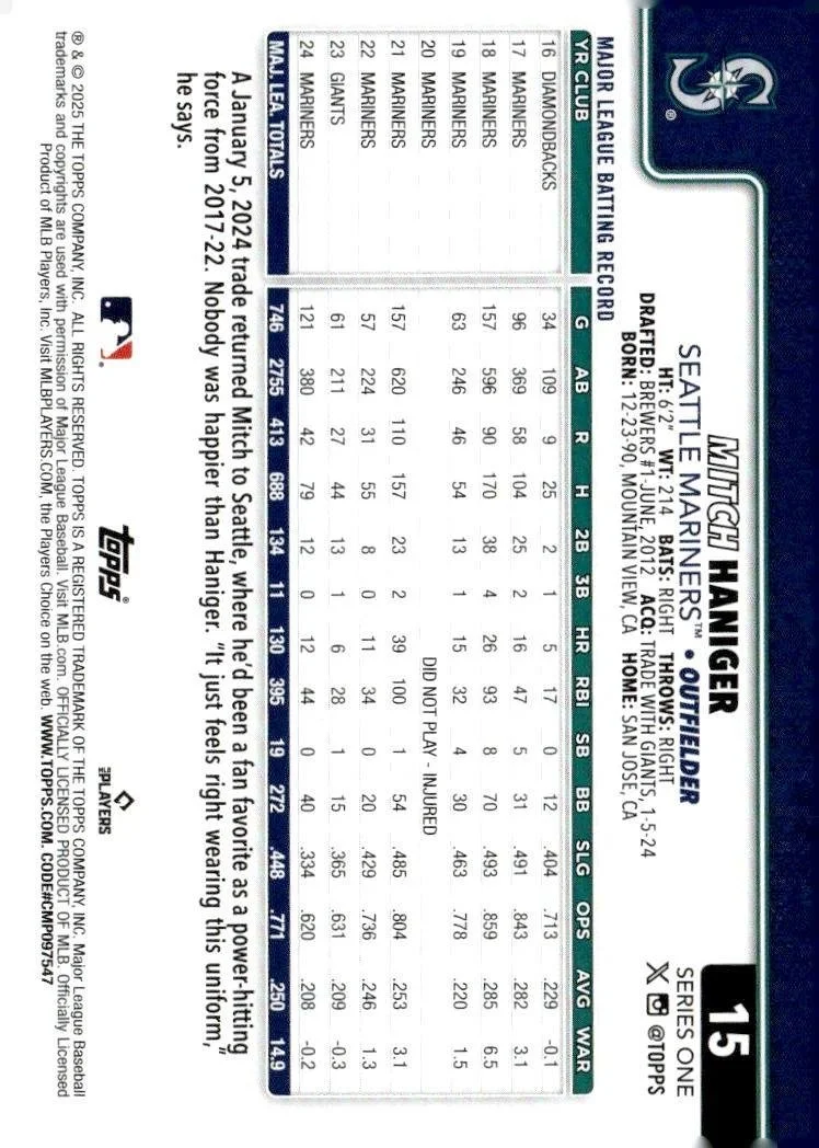 This is a nice example of a 2025 Topps #15 Mitch Haniger