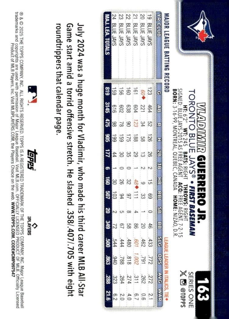 This is a nice example of a 2025 Topps #163 Vladimir Guerrero Jr.
