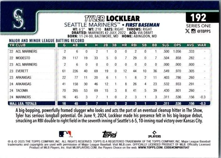This is a nice example of a 2025 Topps #192 Tyler Locklear