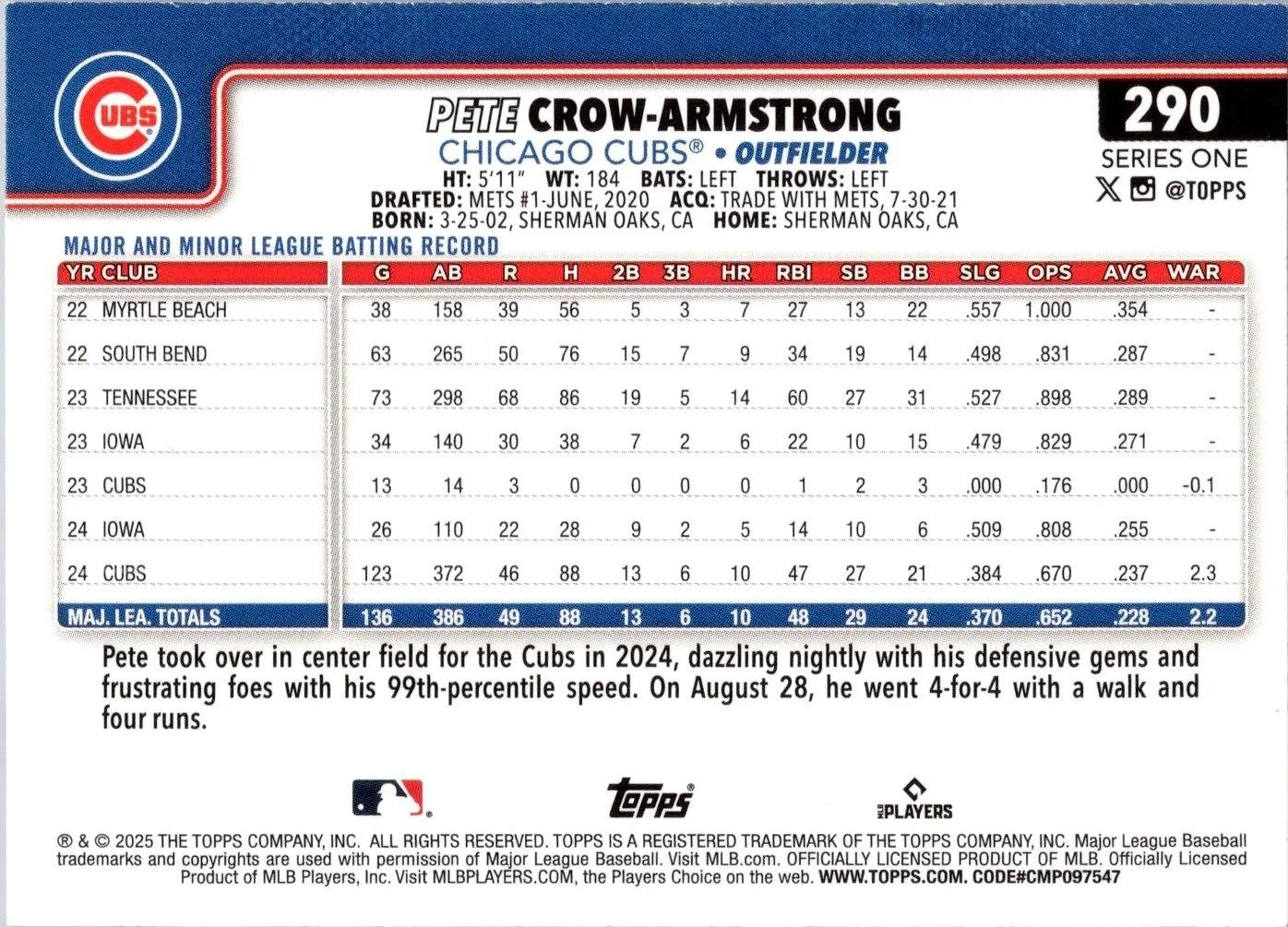 This is a nice example of a 2025 Topps #290 Pete Crow-Armstrong