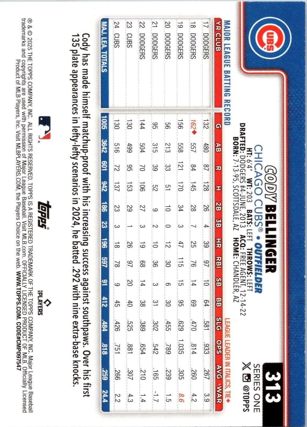 This is a nice example of a 2025 Topps #313 Cody Bellinger Rainbow Foil