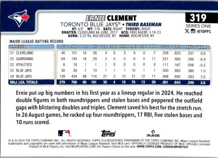 This is a nice example of a 2025 Topps #319 Ernie Clement