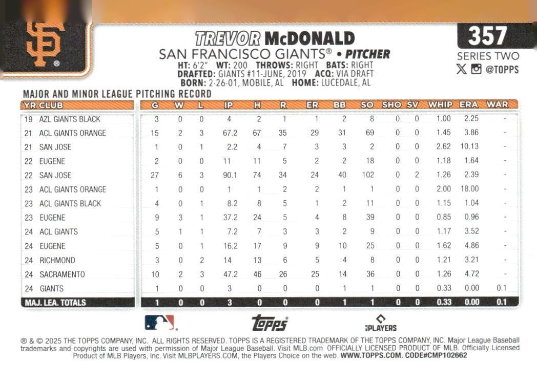 In 2025 Trevor McDonald played for the San Francisco Giants.