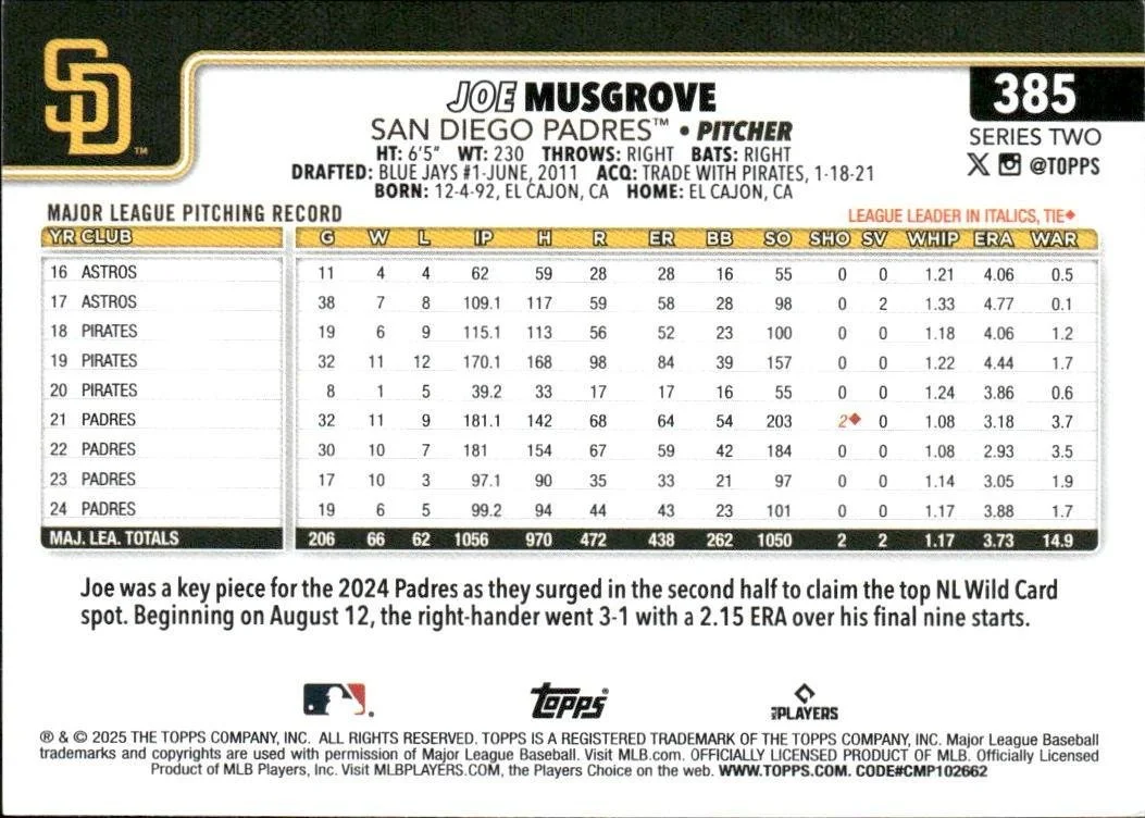 This is a nice example of a 2025 Topps #385 Joe Musgrove