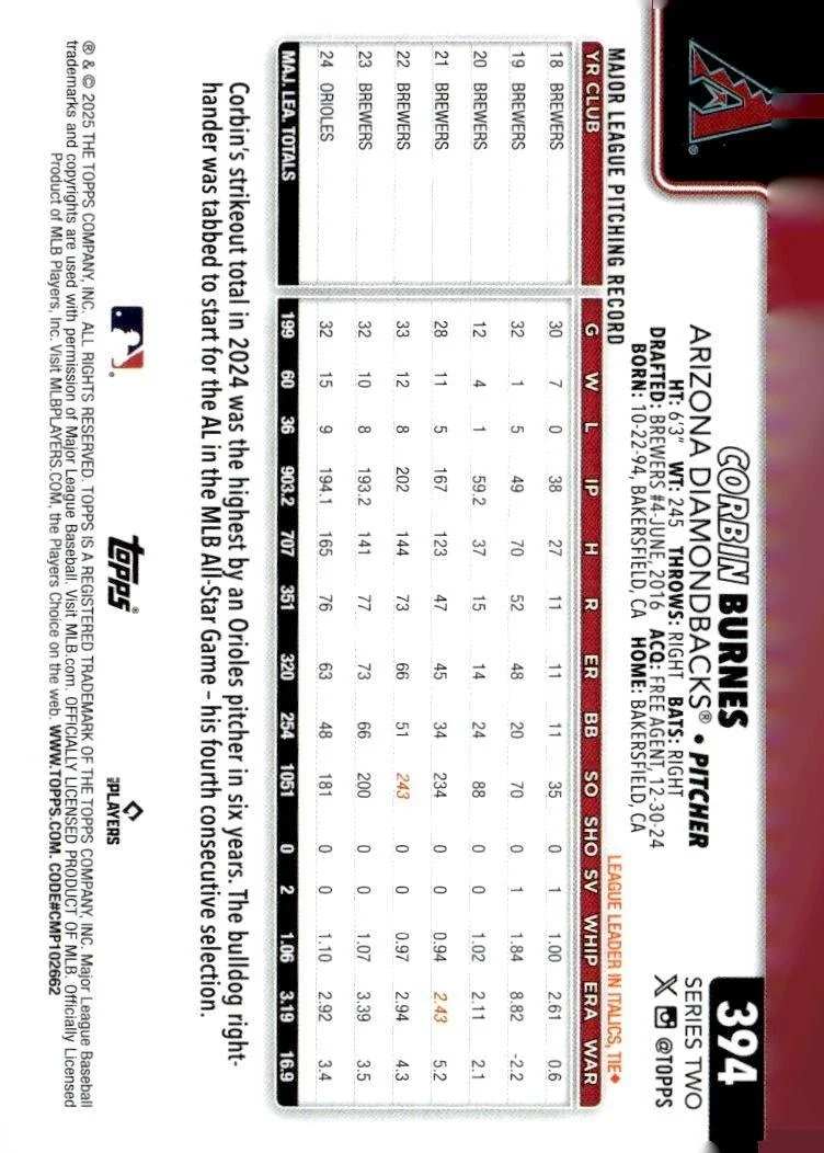 This is a nice example of a 2025 Topps #394 Corbin Burnes
