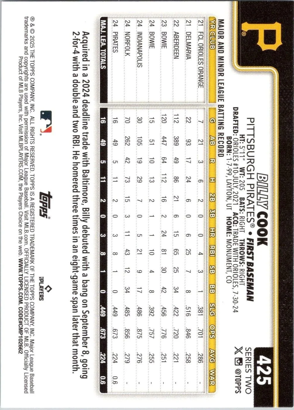 In 2025 Billy Cook played for the Pittsburgh Pirates.