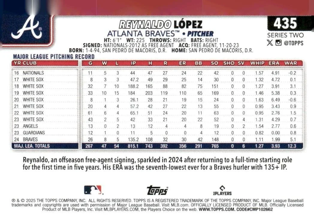 In 2025 Reynaldo López played for the Atlanta Braves.